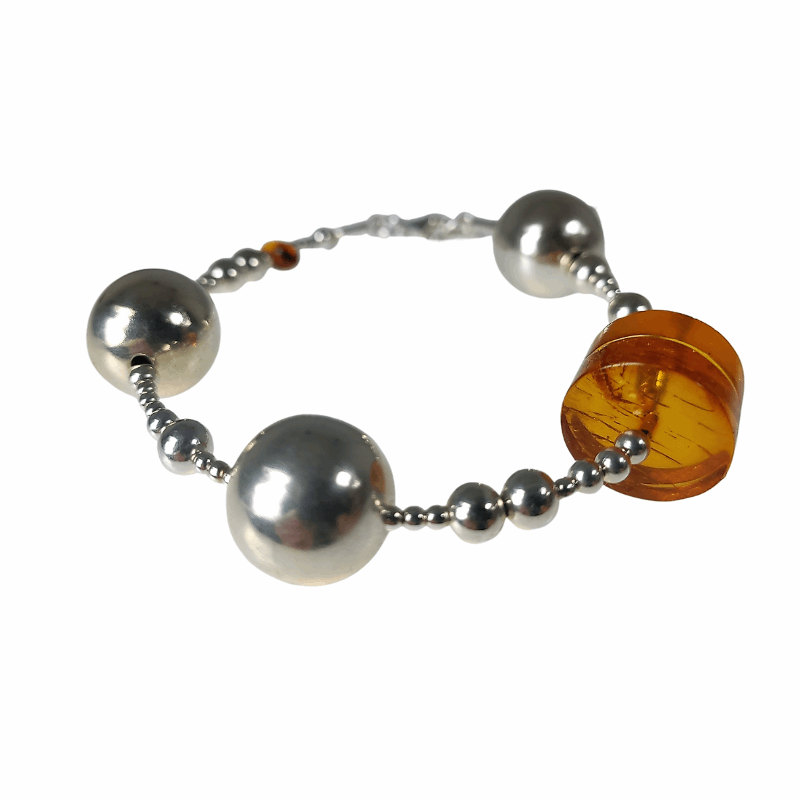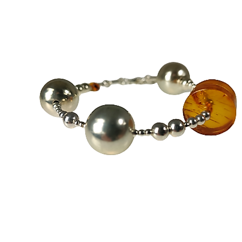 Niepowtarzalny model hand made z naszej pracowni. Niebanalna bransoletka dla wyjątkowych kobiet. Koniakowy bursztyn został zestawiony ze srebrnymi kulkami o różnej wielkości, niezwykle efektowne połączenie srebra i bursztynu.