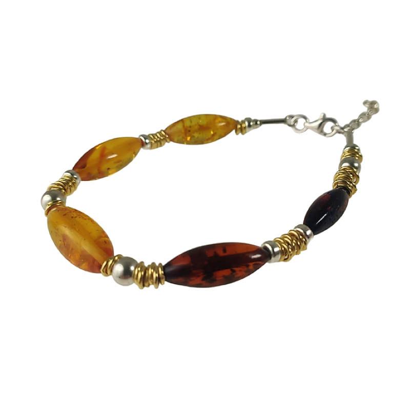 Niepowtarzalny model hand made z naszej pracowni. Niebanalna bransoletka dla wyjątkowych kobiet. Zachwyca swoją różnorodnością, niezwykle efektowne połączenie srebra, pozłacanych elementów i bursztynu.