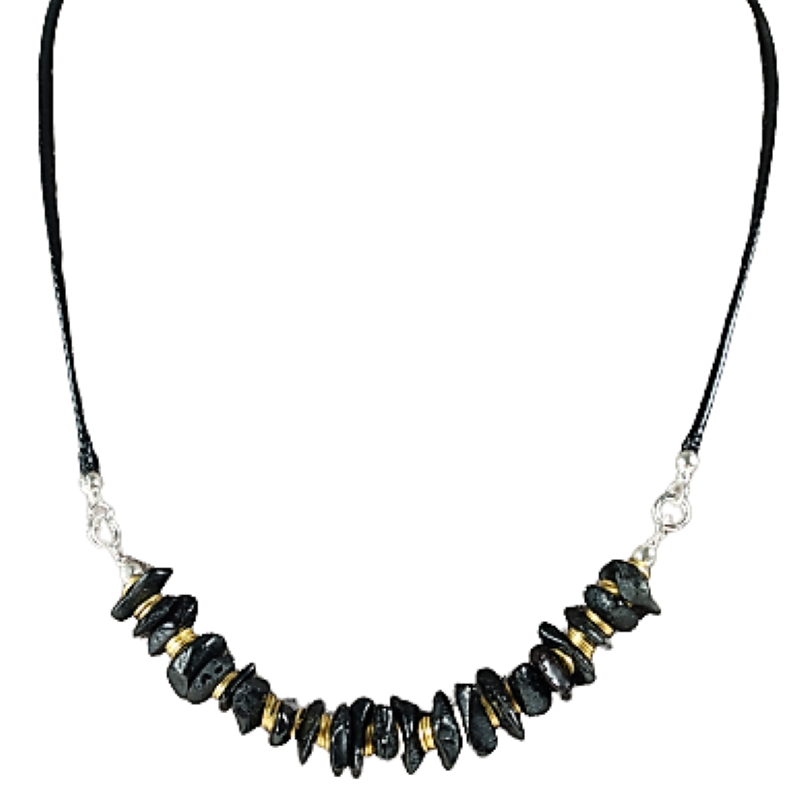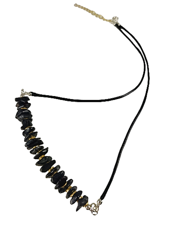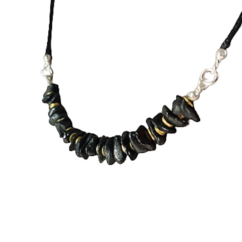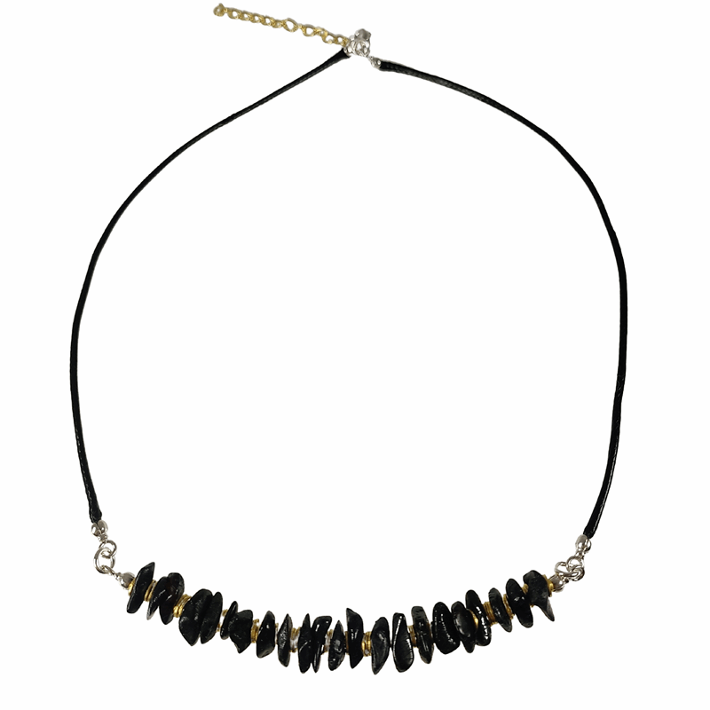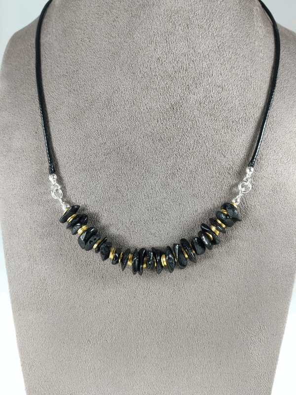 Niepowtarzalny model hand made z naszej pracowni. Kolia na czarnym sznurkowym rzemyku z rzędem bursztynowych kamieni o nieregularnym kształcie w kolorze ciemnej wiśni, które przeplatane są pozłacanymi ozdobnikami, tworząc wyjątkową kompozycję. Półmatowy ciemny bursztyn zachwyca swoim naturalnym pięknem. Sprawdzi się jako świetny dodatek zarówno do codziennych jak i bardziej eleganckich stylizacji.