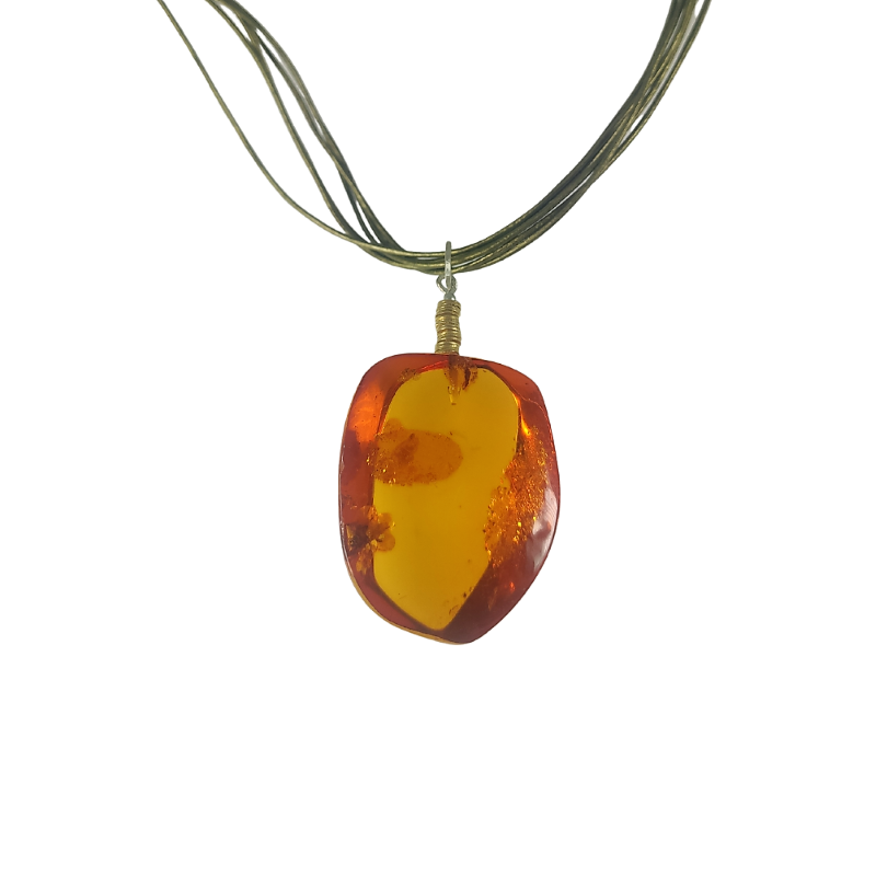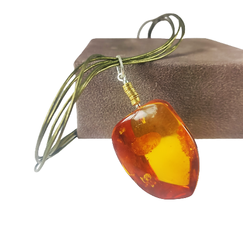 Unikatowy wisior z przepięknego i niepowtarzalnego bursztynu w odcieniu koniaku, na grubym, składającym się z sześciu części, oliwkowym rzemieniu. Niezwykle efektowny naszyjnik z elementami pozłacanego srebra doda szyku wytwornej stylizacji.